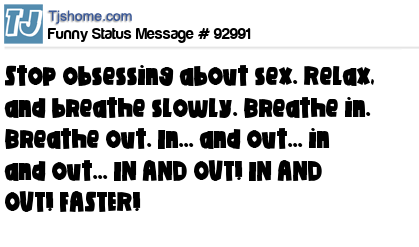 X Stop obsessing about sex. Relax, and breathe slowly. Breathe in. Breathe out. In... and out... in and out... IN AND OUT! IN AND OUT! FASTER!