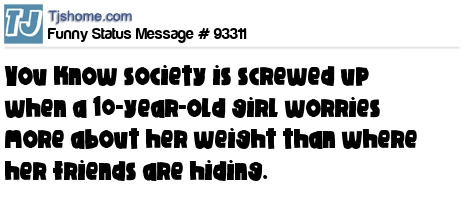 X says You know society is screwed up when a 10-year-old girl worries more about her weight than where her friends are hiding.