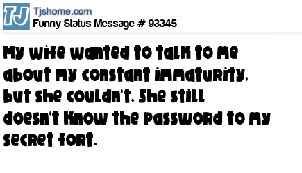 X My wife wanted to talk to me about my constant immaturity, but she couldn't. She still doesn't know the password to my secret fort.