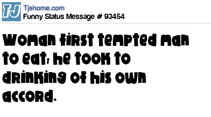 X says Woman first tempted man to eat; he took to drinking of his own accord.