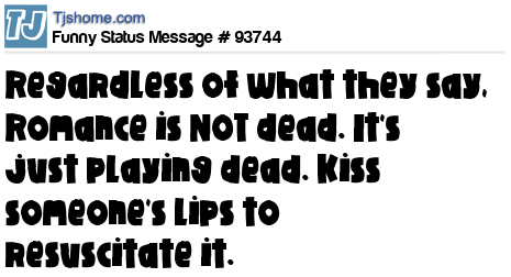 X says Regardless of what they say, Romance is NOT dead. It's just playing dead. Kiss someone's lips to resuscitate it.