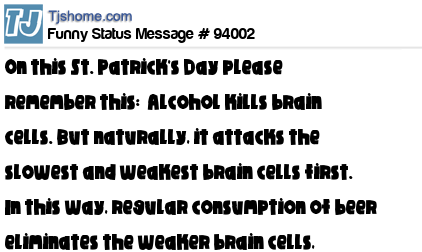 X  On this St. Patrick's Day please remember this:  Alcohol kills brain cells. But naturally, it attacks the slowest and weakest brain cells first. In this way, regular consumption of beer eliminates the weaker brain cells, making the brain a faster and more