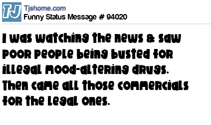 X I was watching the news & saw poor people being busted for illegal mood-altering drugs. Then came all those commercials for the legal ones.