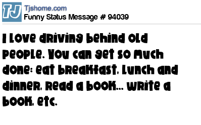 X says I love driving behind old people. You can get so much done: eat breakfast, lunch and dinner, read a book... write a book, etc.
