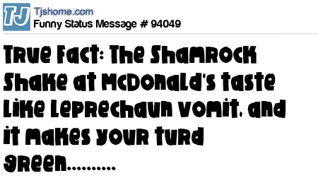 X says True Fact: The Shamrock Shake at McDonald's taste like leprechaun vomit, and it makes your turd green..........