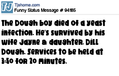X The Dough boy died of a yeast infection. He's survived by his wife Jayne & daughter, Dill Dough. Services to be held at 3:50 for 20 minutes.