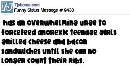 X has an overwhelming urge to forcefeed anorexic teenage girls grilled cheese and bacon sandwiches until she can no longer count their ribs.