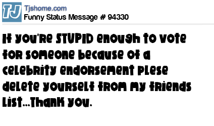 X If you're STUPID enough to vote for someone because of a celebrity endorsement plese delete yourself from my friends list...Thank you.