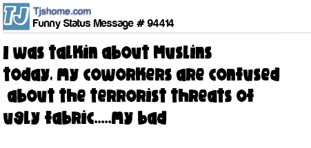 X is I was talkin about Muslins today, my coworkers are confused about the terrorist threats of ugly fabric.....my bad