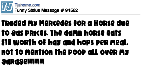 X is Traded my Mercedes for a Horse due to gas prices. The damn horse eats $18 worth of hay and hops per meal, not to mention the poop all over my garage!!!!!!!