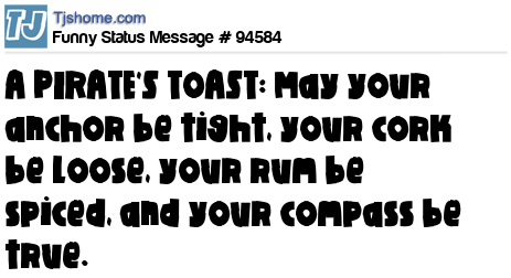 X says A PIRATE'S TOAST: May your anchor be tight, your cork be loose, your rum be spiced, and your compass be true.
