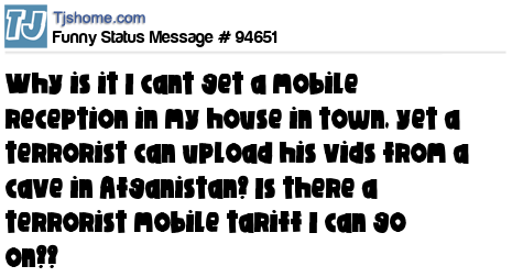X is Why is it I cant get a mobile reception in my house in town, yet a terrorist can upload his vids from a cave in Afganistan? Is there a terrorist mobile tariff I can go on??