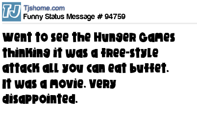 X Went to see the Hunger Games thinking it was a free-style attack all you can eat buffet. It was a movie. Very disappointed.