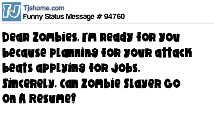 X says Dear Zombies, I'm ready for you because planning for your attack beats applying for jobs. Sincerely, Can Zombie Slayer Go On A Resume?