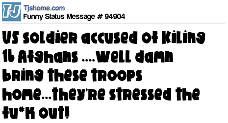 X is US soldier accused of Kiling 16 Afghans ....Well damn bring these troops home...they're stressed the fu*k out!