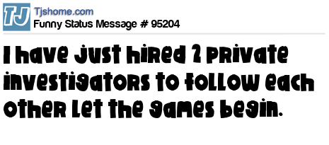 - # 95268 I have just hired 2 private investigators to follow each other..... Let the games begin.