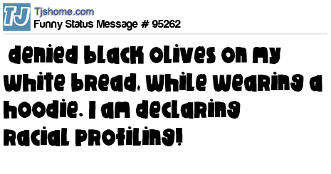 X was denied black olives on my white bread, while wearing a hoodie. I am declaring racial profiling!