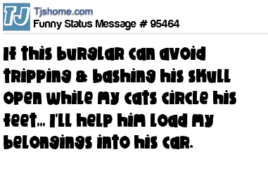 X If this burglar can avoid tripping & bashing his skull open while my cats circle his feet,,, I'll help him load my belongings into his car.