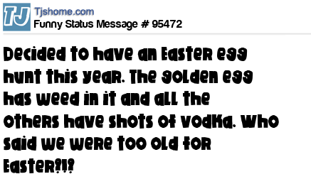 X Decided to have an Easter egg hunt this year. The golden egg has weed in it and all the others have shots of vodka. Who said we were too old for Easter?!?