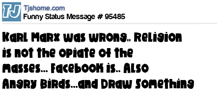 X Karl Marx was wrong,, Religion is not the opiate of the masses... Facebook is.. Also Angry Birds...and Draw Something
