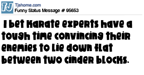 X says I bet karate experts have a tough time convincing their enemies to lie down flat between two cinder blocks.