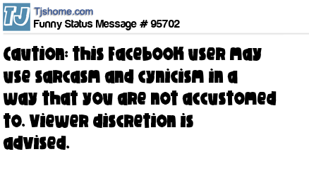 X Caution: this Facebook user may use sarcasm and cynicism in a way that you are not accustomed to. Viewer discretion is advised.