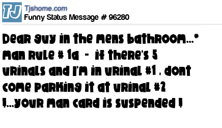 - # 152270 Dear guy in the mens bathroom: Man rule # 1 - If there's 5 urinals and I'm in urinal #1, don't come park it at urinal #2! Your man card is suspended