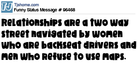 X says Relationships are a two way street navigated by women who are backseat drivers and men who refuse to use maps.