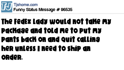 X The FedEx lady would not take my package and told me to put my pants back on and quit calling her unless I need to ship an order.