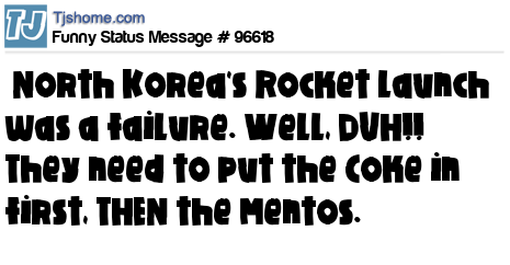 X is North Korea's Rocket launch was a failure. Well, DUH!! They need to put the Coke in first, THEN the Mentos.