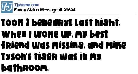 X Took 2 benedryl last night. When I woke up, my best friend was missing, and Mike Tyson's tiger was in my bathroom.
