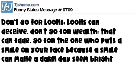 - # 9598 Don't go 4 looks; they can deceive. Don't go 4 wealth; even that fades away. Go for someone who makes you smile because it takes only a smile to make a dark day seem bright