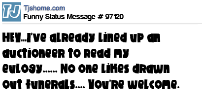 X HEY,,,I've already lined up an auctioneer to read my eulogy...... No one likes drawn out funerals.... You're welcome.