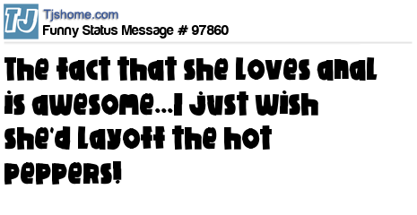 X the fact that she loves anal is awesome...I just wish she'd layoff the hot peppers!