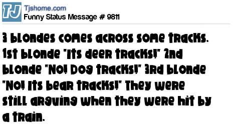 X is 3 blondes comes across some tracks. 1st blonde "Its deer tracks!" 2nd blonde "No! Dog tracks!" 3rd blonde "No! Its bear tracks!" They were still arguing when they were hit by a train.