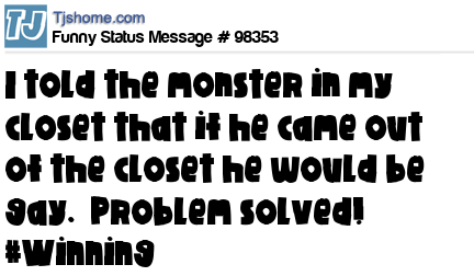 - # 89261 I told the monster in my closet that coming out of there would make him gay. Ha!!,,That solves that problem.