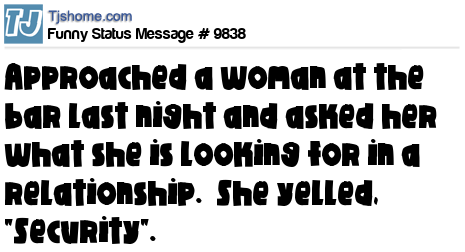 - # 27437 approached a woman at a bar last night and asked her what she is looking for in a relationship. She yelled, "Security!".