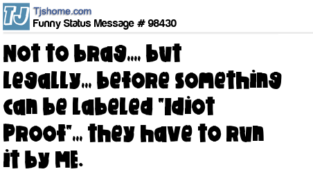 X Not to brag,,,, but legally,,, before something can be labeled "Idiot Proof",,, they have to run it by ME.