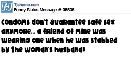 - # 89863 Condoms DO NOT guarentee safe sex anymore... A FB friend of mine was wearing one when he was shot by the woman's Husband...