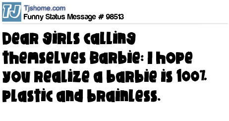 X says Dear girls calling themselves Barbie: I hope you realize a barbie is 100% plastic and brainless.