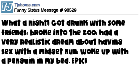 X is What a night! Got drunk with some friends; broke into the zoo; had a very realistic dream about having sex with a midget nun; woke up with a penguin in my bed. EPIC!