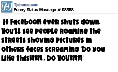 X If Facebook ever shuts down. You'll see people roaming the streets shoving pictures in others faces screaming 'Do you like this!?!?!.. DO YOU!?!?!'