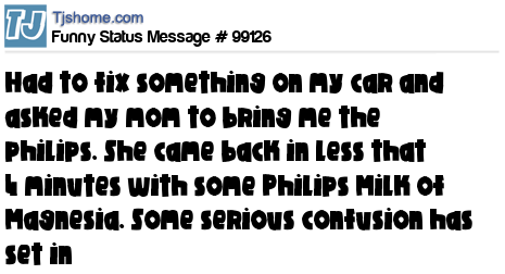 X Had to fix something on my car and asked my mom to bring me the philips. She came back in less that 4 minutes with some Philips Milk of Magnesia. Some serious confusion has set in