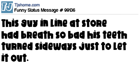 X This guy in line at store had breath so bad his teeth turned sideways just to let it out.