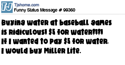 X is Buying water at baseball games is ridiculous! $5 for water?!?! If I wanted to pay $5 for water, I would buy Miller Lite.