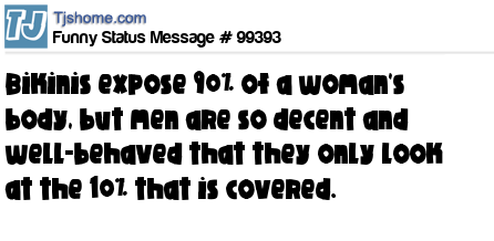 - # 165526 Bikinis expose 90% of a woman's body, but men are so decent, polite and well-mannered that we only look at the remaining 10% that is covered..