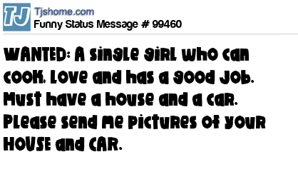 X says WANTED: A single girl who can cook, love and has a good Job. Must have a house and a car. Please send me pictures of your HOUSE and CAR.