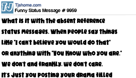 X What is it with the absent reference status messages. When people say things like "I can't believe you would do that" or anything with "You know who you are." We don't and frankly, we don't care. It's just you posting your drama filled life up to generate