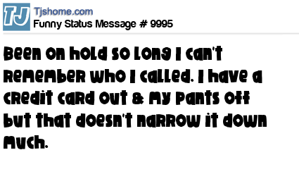 - # 24895 Been on hold so long I forgot who I called. Got a credit card out and my pants off but that doesn't narrow it down much.