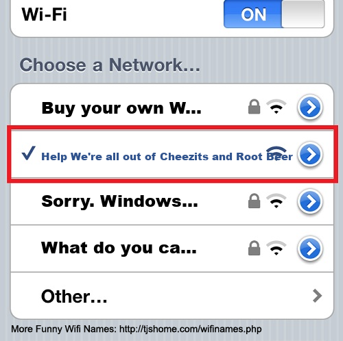 Funny WiFi Name #4648 [Help! We're all out of Cheezits and Root Beer! ]